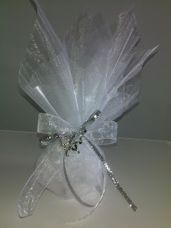 Οι μπομπονιέρες στην βάπτιση, κρεμάστηκαν σε ένα πολύ όμορφο μεταλλικό στολισμένο δεντράκι,(περιμένω φωτογραφίες και μόλις τις έχω, θα τις αναρτήσω) απλώς για μεγαλύτερη διευκόλυνση κατά την μεταφορά τους τις έκανα τσαμπάκια!